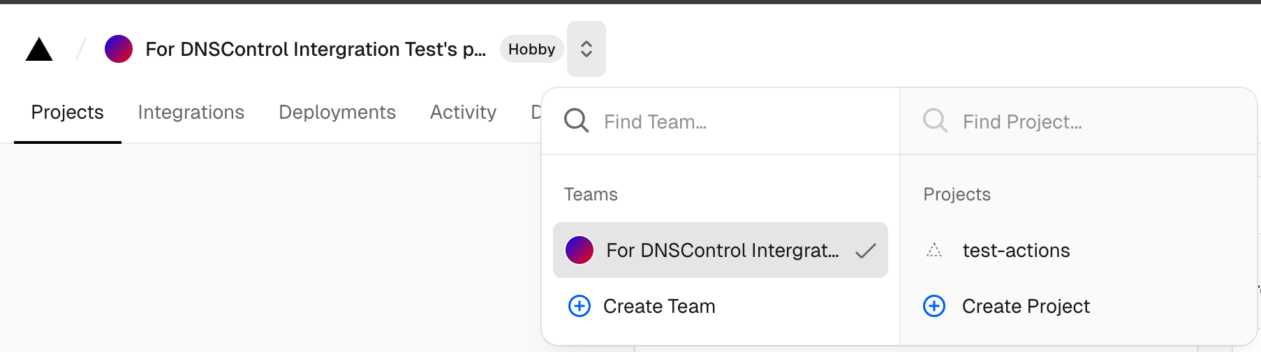 To use this provider, add an entry to creds.json with TYPE set to VERCEL along with a Vercel API Token and your team ID.