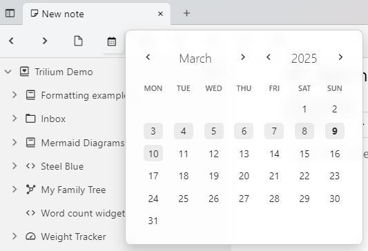 Select an existing day note, and the menubar contains a calendar widget. Select any day to create a note for that day.